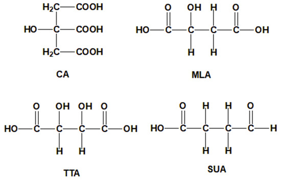 It is proved that the compound of polycarboxylic acids can create a synergistic effect during cross-linking cotton fabric [15,16]. But there are few reports on the compound of polycarboxylic acids applied on dyeing cotton fabric with natural dye. In the paper, the compound of dicarboxylic acid [tartaric acid (TTA), malic acid (MLA), succinic acid (SUA), the structures are shown in Figure 1] and CA as cross-linking agents were added to the dyeing solution of the cotton fabric by madder. The multiple esterification sites generated during the cross-linking dyeing process, and enhanced the cross-linking degree between the cotton fabric, polycarboxylic acid and dye, and improved the dyeing property of the cotton fabric. The morphology and structure of the cotton fabrics before and after dyeing were characterized, the cross-linking dyeing reaction mechanism was analyzed, the differences of color characteristic values, K/S values and color fastness to washing, rubbing and light were discussed, and the anti-wrinkle, anti-ultraviolet properties and the antibacterial property of the dyed cotton fabric were studied. It was looking forward to obtain the multifunctional cotton-based textile while improving the dyeing properties of cotton fabric with madder.