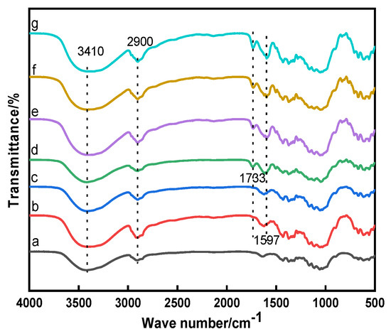 FTIR spectra of the cotton fabrics: a, Raw; b, Direct; c, Mordant; d, CA; e, CA+TTA; f, CA+MLA; g, CA+SUA.