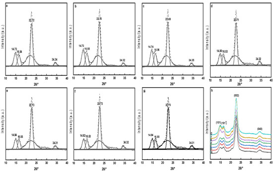 XRD peak-splitting fitting diagrams of the cotton fabrics (a, raw; b, Direct; c, Mordant; d, CA; e, CA+TTA; f, CA+MLA; g, CA+SUA c), h, X-ray diffraction curves of the cotton fabrics.
