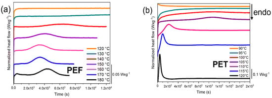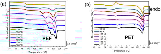 Heating scans, performed at 20 °C/min, of the previous isothermally crystallized samples for (a) PEF, from 25 °C to 250 °C and (b) PET, from 25 °C from 275 °C, measured by DSC.