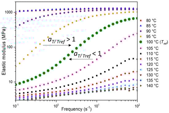 The master curves are deduced from isothermal frequency scans, from 1 Hz to 100 Hz. The temperature step is of 5 °C, from 85 °C to 135 °C. Only a horizontal shift is applied. These frequency scans, performed in the forming range, are visible for PEF in Figure 4.