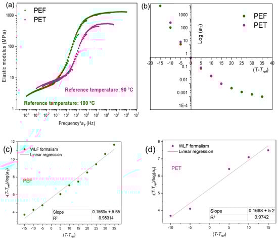 According to the protocol explained, the typical PEF and PET master curves are given in Figure 5a,b depicts the evolution of the shift factor for both materials depending on the gap from the reference temperature. Figure 5c,d depict the linear regression that validates the WLF formalism of the PEF and PET master curves. From the equation of the linear regression the WLF factors ( and ) are obtained. Table 2 summarizes the values of the WLF parameters found.