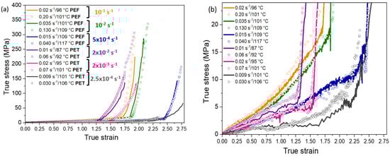 (a) True stress/strain curves of uniaxially stretched PEF and PET. Each colour is associated to an equivalent strain rate. Within an equivalent strain rate, lines are for “slow” tests while dots belong to “rapid” tests; (b) a zoom is made on the first deformation stages.