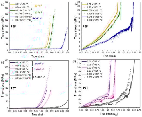 True stress/strain curves for (a) and (b) PEF, (c) and (d) PET.