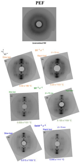 Debye-Scherrer patterns of stretched PEF, with (a,c,e) “slow” and (b,d,f) “rapid” strain rates.