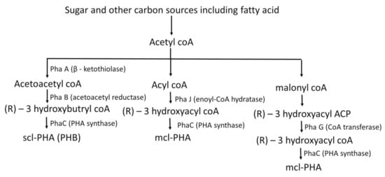 PHA is widely produced by microorganisms irrespective of whether it is a Gram-positive or Gram-negative bacterium [25]. Various microorganisms synthesize polyhydroxyalkanoates (PHAs) as a physiological strategy related to the utilisation of nutritional resources in an ecosystem [26]. PHAs can be accumulated in about 94% (w/w) of the dry cell mass inside the bacterial cells [2] and the basic structure is illustrated in Figure 1. They are produced continuously through a chain of chemical conversions that occur in the cell and PHA is accumulated within the cytoplasm of the cell as energy reserves. PHAs appear to be similar to a compact granule inside the cell and provide the nourishment to the cell for growth when surplus carbon is provided [27]. The granules of the PHAs are coated with phospholipids and proteins called phasins, and these phasins play a vital role in size of the PHA granule [28,29]. The production pathway of PHAs starts as a sequence wherein β-ketothiolase effectuates the formation of two acetyl-CoA molecules. The acetyl CoA molecule sustains a NADPH-dependent reaction that catalyzes the addition of hydrogen to impart hydroxybutyryl CoA molecules. The PHB enzyme synthase converts hydroxybutyryl CoA molecules into PHB granules [30]. The yield of PHA is directly proportional to the correspondence of the co-enzymes NADH and NAD+ [31] which restrict acetyl-CoA entering the Krebs cycle [32] (Figure 2). Sometimes, mcl-PHA is synthesized from longer carbon chain monomers wherein the β-oxidation of long chain fatty acids converts into monomers of (R)-3-hydroxyacyl-CoA which takes place through the action of an enzyme named enoyl-CoA hydratase (PhaJ) [33], where the mcl-PHA is synthesized by PhaC (PHA synthase). From the simple sugars, fatty acids are synthesized through a de novo pathway leading to the formation of 3-hydroxyacyl (3HA) precursors. These precursors are converted into acetyl-CoA and then to malonyl-coA, where specific CoA transferase (PhaG) forms (R)-3-hydroxyfatty acids from malonyl coA [34,35]. (R)-3-hydroxyfatty acids are accumulated in the form of mcl-PHA by Pha C [36,37,38].