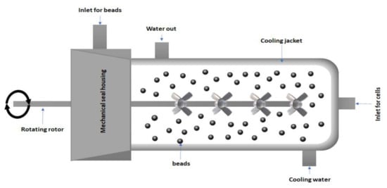 The mechanical method is a method where the cell wall components are broken by a mechanical force and is used mostly to recover intracellular components such as PHA without the use of any solvents [106]. It is a promising method for use on an industrial scale. The principle behind bead milling or bead homogenization is based upon shearing force, impact force, hitting force, and energy transfer from the beads to the cell mass (Figure 3). Bead milling is independent of the biomass concentration [107]. Bead diameter, bead density, bead filling, agitator speed, and feed rate must be optimized depending upon the rigidity of the cell. It consists of a grinding cylinder with variable speed rotor for grinding. The grinding process generates heat which is counter balanced by circulating cooling water surrounding the chamber. Although the alkaline pretreatment of cells containing PHA granules enhances single-pass disruption in a high-pressure homogenizer, full protein release requires at least two passes [108]. To improve single-pass disruption, substances such as 0.1% SDS, sodium chloride, potassium chloride, lysozyme, EDTA, or mixtures of these can be employed [109]. Gutt et al. [110] used ANOVA models to improve a technique for extracting P3HBHV from Cupriavidus necator. They devised a technique that combines mechanical disintegration with surfactant treatment, which has been shown to be more effective than utilizing only one. The intricacy of the parameter interactions makes the bead milling process difficult to anticipate and so it is not widely used. This procedure also has a long processing time and usually requires several steps so it can be coupled with enzymatic digestion [111].