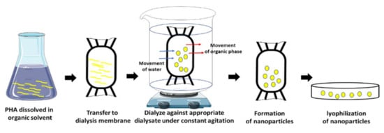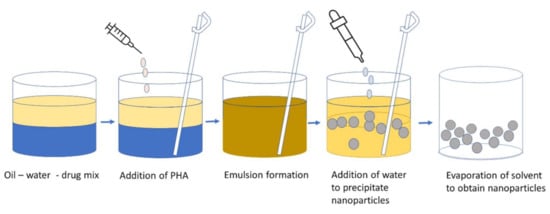 In the emulsion solvent diffusion method, PHA is mixed in an oil and water emulsion (sometimes drugs are added too) as the organic solvent is immiscible with water and an emulsion is formed upon stirring [185]. This emulsion is diluted by adding excess water under continuous mixing to overcome the miscibility of the organic solvent with water. Polymeric nanoparticles are formed which precipitate as the organic solvent diffuses into the water [186]. The emulsion evaporates to give nanoparticles (Figure 6). Guerrero et al. [187] suggested that nanoparticles are formed when the diffusion of solvent reaches supersaturation due to phase transformation. The size of the nanoparticles depends on the rate of stirring and the concentration of the polymer used. Sometimes sonication is also added to the step to produce nanoparticles of between 80 and 200 nm [188,189]. The emulsion solvent diffusion method has two types, namely, the single emulsion encapsulation method and the double emulsion encapsulation method. The prior method is for hydrophobic samples and the latter is for hydrophilic samples [190,191]. The type and number of surfactants such as polyvinyl alcohol (PVA), sodium dodecyl sulphate (SDS), and didodecyl dimethyl ammonium bromide (DMAB) can influence the size of the PHA nanoparticles [192]. A lower concentration of surfactant contributes to a high polydispersity and particle aggregation, whereas excessive surfactant can lead to a decrease in the drug loading efficiency. The oil-in-water emulsion–solvent evaporation process is the most common way to make PHA nanoparticles which involves the addition of an emulsifier, such as poly(vinyl alcohol), to an aqueous solution containing an organic phase, such as a PHA polymer dissolved in a solvent. The nanoparticles obtained by this procedure are between 100 and 200 nm in size and can be used as drug carriers [188,193].