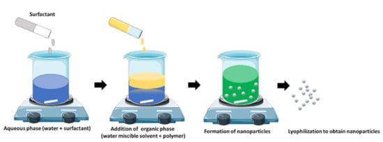 This involves a specific interaction between the organic solvent and the polymer to form a precipitate. The intermixing of the non-polar solvent with the aqueous portion of the solution that contains the polymer allows the formation of a nanoparticle and it can occur in the presence as well as in the absence of a surfactant [194] (Figure 7). This method is also known as the solvent displacement method [195,196]. Polylactic acids form characteristic nanospheres through the process of precipitation in the presence of a solvent whose polarity allows it to be miscible in all proportions when dissolved in water. The resulting mixture is injected into the water portion wherein the addition of a surfactant maintains the shape and stability of the nanocarrier [197]. The surfactant helps to create a stable shape with hollow cavities, where the encapsulation efficiency of the lipophilic drugs is increased [198,199]. Senthilkumar et al. [200] prepared PHB-based nanoparticles using SPAN 20 as a surfactant which were then loaded with a hydrophobic curcumin drug. The nanoparticles were found to be below 300 nm in size and spherical in shape.
