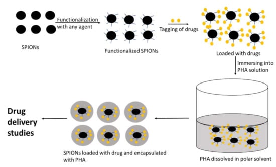 PHAs have desirable physical characteristics and excellent biocompatibility. As a result, they can be useful as coating agents for metal-based nanoparticles. Samrot et al. [204,205] utilized PHB for coating SPIONs which was functionalized with oleic acid and tagged with drug itraconazole as illustrated in Figure 9. It was observed that following encapsulation with PHB, the size of naked SPIONs increased from 40–45 nm to 100–130 nm. The drug-loaded nanoparticles had good drug release as well as inhibitory activity against Pseudomonas aeruginosa and Candida albicans. By entrapping (or wrapping to) bioactive nanoparticles through their biopolymeric chains, PHAs can stabilize metallic nanoparticles (ZnO-NPs, Ag-NPs) by acting as a framework for regulating the development of bioactive nanoparticles, thereby preventing aggregation [206].