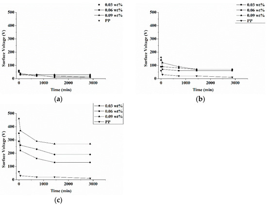 Surface voltage of antibacterial electret PP filters as related to triclosan amount (0.03, 0.06, and 0.09 wt%) and electric field intensity being (a) 1.5 kV/cm, (b) 2.0 kV/cm, and (c) 2.5 kV/cm.