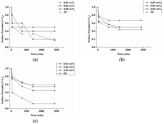 Surface potential of antibacterial electret PP filters as related to triclosan amount (0.03, 0.06, and 0.09 wt%) and electric field intensity at (a) 1.5 kV/cm, (b) 2.0 kV/cm, and (c) 2.5 kV/cm.