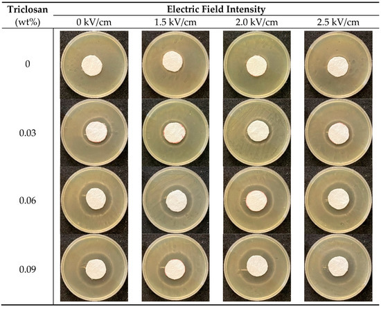 Inhibition zone against E. coli of samples as related to triclosan amount (rows 1–4: 0, 0.03, 0.06, and 0.09 wt%) and electric field intensity (columns 1–3: 1.5, 2.0, and 2.5 kV/cm).
