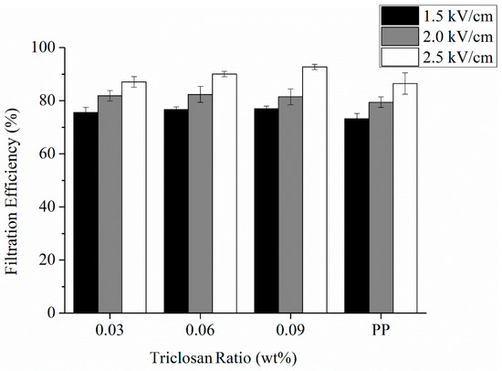 Filtration efficiency of antibacterial electret PP filters as related to triclosan amount (0.03, 0.06, and 0.09 wt%) and electric field intensity (1.5, 2.0, and 2.5 kV/cm). The control group (electret pure PP nonwoven fabrics) contains 0 wt% of triclosan.