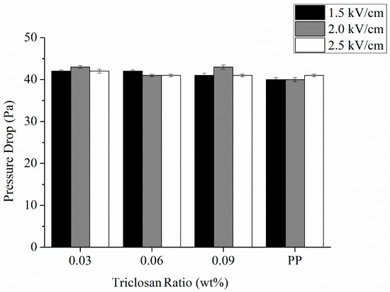 Pressure drop of antibacterial electret PP filters as related to triclosan amount (0.03, 0.06, and 0.09 wt%) and electric field intensity (1.5, 2.0, and 2.5 kV/cm). The control group (electret pure PP nonwoven fabrics) contains 0 wt% of triclosan.