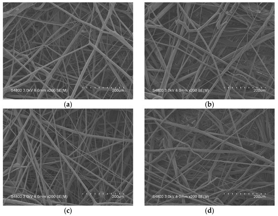 SEM images of antibacterial electret PP filters as related to the triclosan content being (a) 0 wt%, (b) 0.03%, (c) 0.06 wt%, and (d) 0.09 wt%.