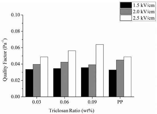 Generally speaking, it is not feasible to compare the filtration efficiency and pressure drop directly when the structure and thickness of filters are different. To solve this issue, the quality factor is then employed for the comparison. According to Figure 8, when there is a higher electric field intensity and a greater triclosan amount, there is a higher quality factor concurrently. When the pressure drop is specified, a higher efficient filtration means a greater quality factor equivalently.