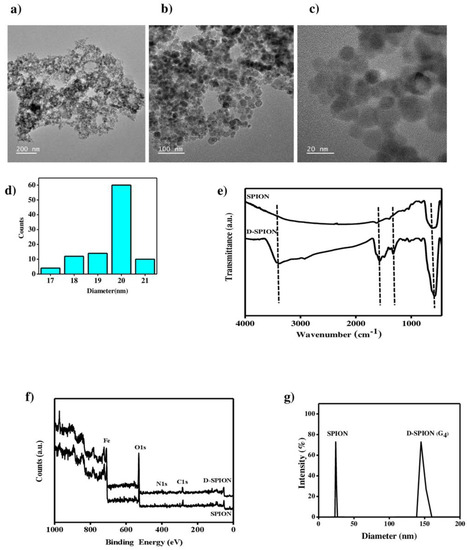 Shows the (a–c) TEM images of the D-SPIONs; (d) size distribution histogram of D-SPIONs; (e) FTIR spectra; (f) XPS survey patterns; (g) DLS of the SPIONs and D-SPIONs.