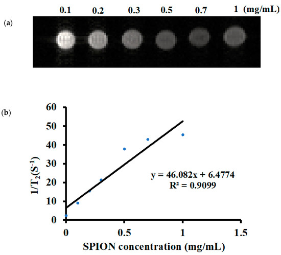 Figure 4 presents the MRI images of the D-SPIONs specifically, T2 images at various sample concentrations (Figure 4a) and relaxation rates against various sample concentrations (Figure 4b). Dose dependence was noted, as indicated by the darkening that occurred as the spin–spin relaxation time (T2) was shortened. The transverse relaxation rate (1/T2) versus the various concentrations of the D-SPIONs is presented in a linear plot [35]. The relaxivity r2 was calculated to be 46 mM−1S−1.The SPIONs and D-SPIONs were reported to enhance the transverse relaxation rate more than the longitudinal relaxation rate and be a negative contrast agent. Dendrimer-based MRI contrast agents has also been used for imaging brain tumors [36]. As synthetic macromolecules, dendrimers can improve the relaxivity in MRI because of their 3D structures, tunable sizes, and abundant surface terminals. Furthermore, they can increase the positivity of iron oxide. Coating dendrimers on the SPION surface promote their specific targeting, enhance MRI image quality, reduce their toxicity on cells, and allow for safe in vivo imaging.