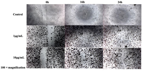 Migration assay of BCECs treated under varying concentrations of D-SPIONs over 16 and 24 h.