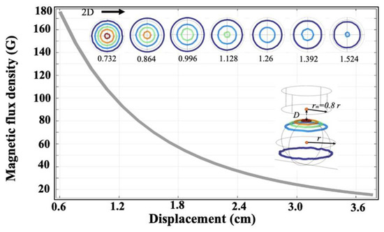 In the simulation, we assumed no current conveyance in the domain (H = 0); next, the magnetic flux density was adjusted through the magnet. The magnetization was calculated to be 104 (A/m) in the z direction from the electromagnet under a rm of 0.8r and a D of 0.2r. Table 1 lists the other parameters. The magnetic flux density created on the ocular surface was inversely proportional to the magnet’s displacement from the ocular surface (Figure 7). When the displacement was increased, the magnetic flux density decreased, affecting the number of magnetic patterns on the ocular surface. In this regard, the isometric line vortex around the magnetization direction was considered.