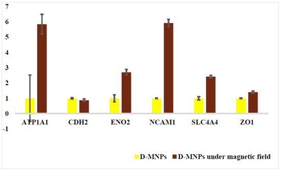 Gene expression level of BCECs incubated with D-SPIONs and treated with an electromagnet system using real time PCR. The genes were normalized using GAPDH. The cells incubated with the MNPs were used as the control group and statistically differences were (p < 0.05; n = 3). Data are presented as the means standard deviations of three experiments.
