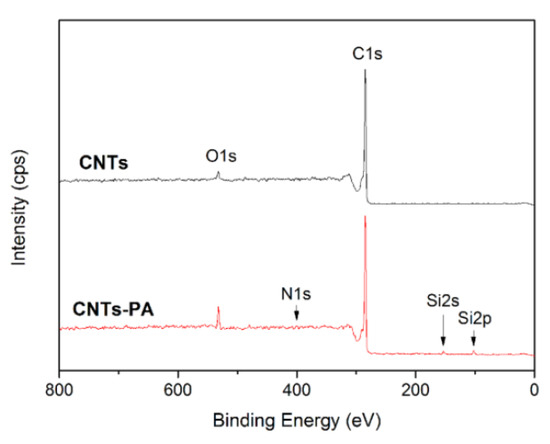 XPS survey spectra of CNTs and CNTs-PA.