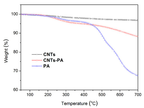 TGA curves of CNTs, PA and CNTs-PA.