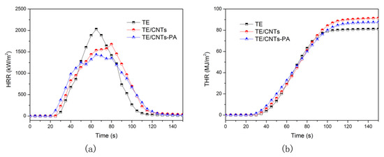 HRR (a) and THR (b) curves of TE and TE/CNTs-PA nanocomposites.
