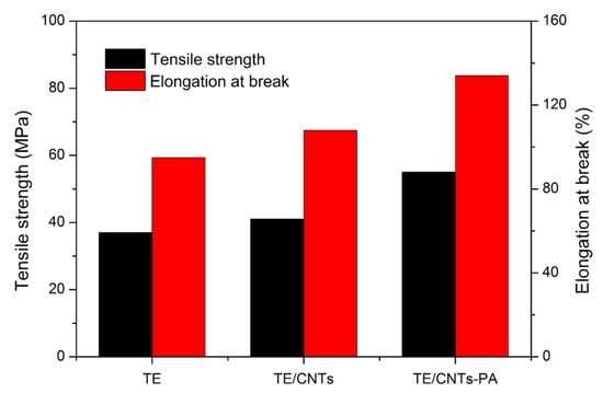 Figure 9 shows the mechanical properties of TE nanocomposites. It can be seen that the tensile strength and elongation at break of pure TE were 37 MPa and 95%, respectively. After adding carbon nanotubes, the tensile strength and elongation at break of TE were increased to 41 MPa and 108%, respectively, which were higher than those of pure TE. Furthermore, the mechanical properties of TE nanocomposite were further improved by the addition of CNTs-PA. Compared with pure TE, the tensile strength and elongation at break of TE/CNTs-PA were increased by 48.6% and 41.1%, respectively. The results showed that the improvement of mechanical properties of TE nanocomposite by carbon nanotubes is closely related to the compatibility and dispersion of carbon tubes in polymer matrix, and CNTs-PA can effectively improve the mechanical properties of TE nanocomposite.