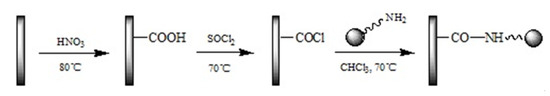 The CNTs-COCl was synthesized as follows (Scheme 2): The mixture of CNTs, HNO3 (30 mL) and H2SO4 (90 mL) was sonicated at 50 °C for 2 h. After termination of reaction, it was allowed to cool down to room temperature. The mixture was diluted with a large amount of deionized water, followed by a vacuum-filtering through a nylon film (0.22 μm, Sangon Biotech (Shanghai) Co., Ltd., Shanghai, China). The obtained solid CNTs-COOH, in which polar carboxyl groups were introduced into the convex surface of CNTs, was washed with deionize water until the aqueous layer reached neutral, and then was vacuum-dried at 80 °C for 12 h. The reaction mixture of CNTs-COOH (200 mg), SOCl2 (20 mL) and DMF (1 mL) was sonicated at 50 °C for 1 h, and then refluxed at 70 °C for 24 h. After that, the temperature was risen to 120 °C and CNTs-COCl was obtained after residual SOCl2 was removed by the reduced pressure distillation.
