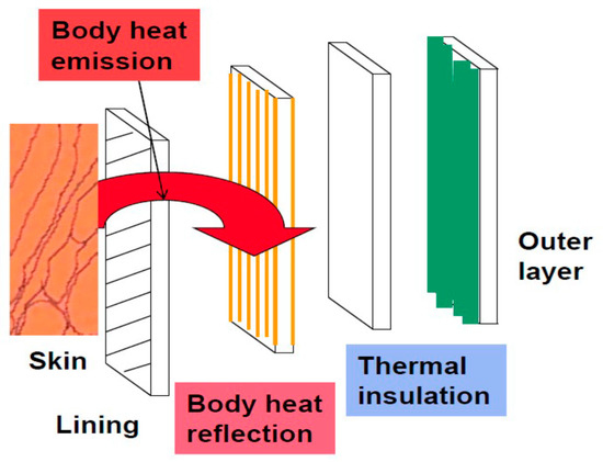 Terms such as “smart” or “intelligent” are used in the context of differentiating new materials and structures from traditional materials and structures [1]. The materials themselves cannot be smart but have only special properties used to construct intelligent structures. Structures that are able to independently evaluate the state of the environment and respond appropriately to it are then referred to as intelligent. Smart textiles are textile structures that are sensitive to external stimuli (various types of radiation, pH, mechanical magnetic or electric fields) and, depending on changes in these stimuli, react reversibly (usually by changing porosity, color [2,3] and shape, among others). Textiles with only multifunctional effects have special properties (e.g., antibacterial activity, ultraviolet protection, electromagnetic shielding, photocatalytic self-cleaning) [4,5], but not reversible reactions. Far infrared (FIR) textiles are typically multifunctional because they have electromagnetic shielding and antimicrobial properties as well. Control of the far-infrared region (further FIR) radiation via the thermal radiation properties of textile layers has a significant effect on localized heating or cooling of the human body under given indoor conditions. Considerable energy savings can be expected by developing radiative heating textiles, as space heating holds a much larger proportion of all the energy consumed in the buildings sector than space cooling.