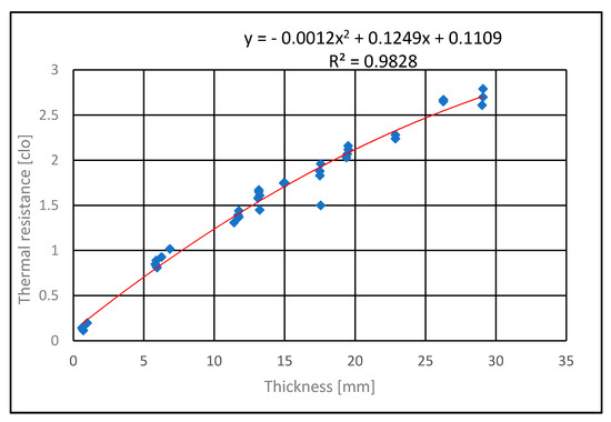 The resulting thermal resistance values in clo units for individual layers and all types of sandwiches are plotted against the thickness [mm] in Figure 4 and Figure 5. In Figure 4, all data are fitted by a polynomial of the 2nd degree the using linear regression:
