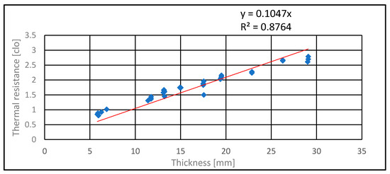 In Figure 5, thermal resistance in clo units is selected except for thin layered textiles (Table 6). The model Rc = a h is used. The slope of the regression line is related to the thermal conductivity of individual layers. This corresponds to the assumption that all layers have nearly the same thermal conductivity (a = 0.1047 clo/mm, λ = 0.062 W∙m−1∙K−1).