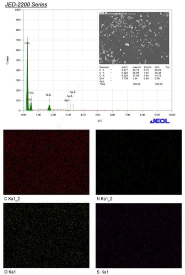 Figure 5 shows the distribution of FS in CPEEUA/FS-40 matrix. EDX and elemental analysis confirmed the dispersion of FS in the CPEEUA matrix. The energy peaks of FS (Si), C, N, and O are evident and confirm the presence of FS in CPEEUA matrix, with their respective content of 44.18, 36.99 and 17.59. The wt% of SiO