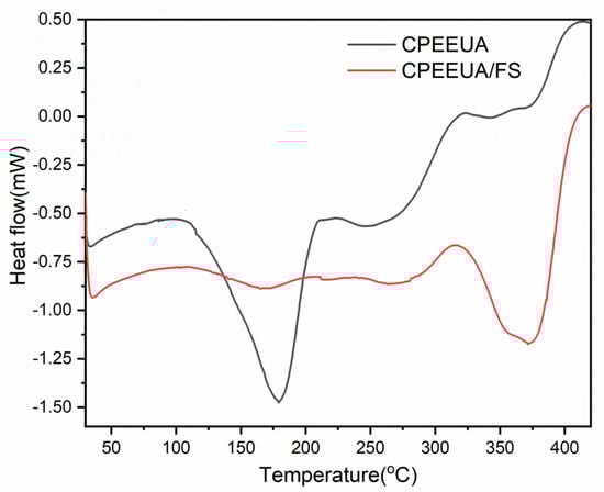 Figure 6) shows that the first endothermic event starts from 108 °C to 209 °C, centered at 178 °C. While this endothermic event is insignificant in CPEEUA/FS-40. This first endothermic event may be correlated to the loss of moisture. The second endothermic event extends from 226 °C to 321 °C in CPEEUA-40 and CPEEUA/FS-40. The third significant and broad endotherms appear from 322 °C to 412 °C, respectively, in CPEEUA-40 and CPEEUA/FS-40, which can be attributed to the configurational changes in polymer backbone due to subsequent thermal degradation stages as evident in TGA and DTG.