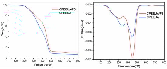 Figure 7). Beyond this temperature, the degradation can be attributed to the onset of decomposition of the urethane bonds, proceeded by subsequent degradation of other moieties of polymer backbone, under the effect of rising temperature. A significant variation is observed in the degradation pattern of CPEEUA/FS-40 from TGA and DTG thermogram; this showcases its improved thermal stability relative to CPEEUA-40. 20wt%, 30wt%, 40wt%, 50wt%, 60wt%, and 70 wt% losses are observed at 300 °C, 333 °C, 363 °C, 397 °C, 425 °C, 445 °C, and 316 °C, 376 °C, 417 °C, 434 °C, 449 °C, 459 °C, in CPEEUA-40 and CPEEUA/FS-40, respectively. The remarkable variation in thermal degradation temperatures, for each wt% loss, in CPEEA-40 and CPEEUA/FS-40 highlights good thermal stability of the nanocomposite, due to fine and homogenous dispersion of FS as well as good interfacial interactions with the matrix. CPEEUA-40 displays a somewhat single-step degradation pattern contrary to CPEEUA/FS-40 which exhibits a notable two-step degradation pattern, covering 90 wt% loss. TGA indicates that these coatings can be safely used up to 250 °C.