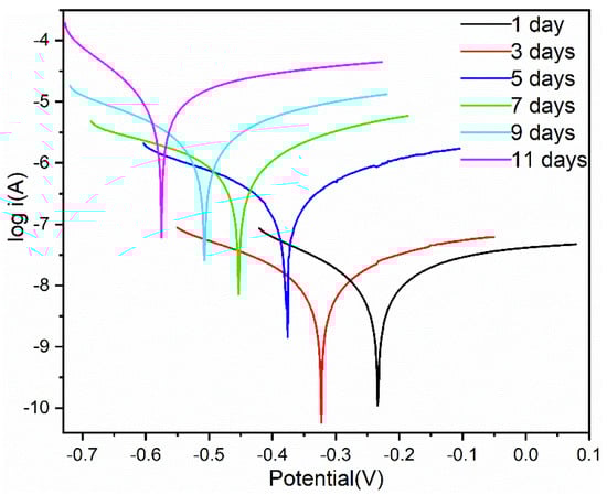 Table 1) by the tafel extrapolation method. CPEEUA/FS-40 showed good corrosion protection for MS. However, it is clear from the table that the corrosion potential of CPEEUA/FS-40 coatings pointedly decreased and corrosion current density increased with increased immersion time in the said corrosive medium. These results indicate that CPEEUA/FS-40 can act as protective layer of MS and improve the corrosion resistance performance up to 7 days, then reduce the coating performance due to the formation of some pores in coatings, resulting in contact of corrosive ions to substrate during the long immersion time (11 days) and corrosion potential of CPEEUA/FS-40 coatings also shift towards the more negative potential during these immersion times [