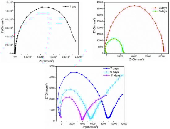 Figure 9, the corrosion protection performance of CPEEUA/FS-40 was investigated by EIS during 1, 3, 5, 7, 9, and 11 days of immersion of nanocomposite coated metal strips in a 3.5 wt% NaCl medium, as a function of exposure times.
