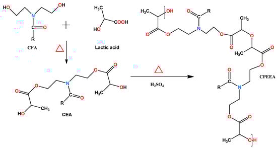 N′-bis-2-hydroxyl ethyl CANO amide [CFA], by amidation. CFA was treated with LA, producing CANO-based poly (ester ether) amide [CPEEA]. Generally, VO based PEA coatings, obtained by a chemical reaction between a fatty amide diol and a difunctional acid, lack superior mechanical strength and cannot withstand an alkaline medium; i.e., their corrosion protection performance in an alkaline medium is poor [