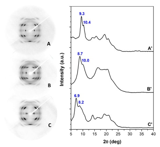 Patterns A and A’ (mainly the equatorial peaks at 2θ = 9.3° and 10.4°) indicate the presence of the γ phase [46]. Patterns B and B’ (mainly the equatorial peak at 2θ = 8.7° and the shoulder at 2θ ≈ 10°) indicate the presence of the triclinic NC δ phase [17]. Patterns C and C’ (mainly the equatorial peaks at 2θ = 6.9° and at 2θ = 8.2°) indicate the presence of the orthorhombic NC ε phase [19].