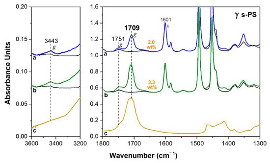Polarized FTIR spectra for 3600−3200 cm−1 and 1800−1500 cm−1 regions of axially oriented γ, δ and ε s-PS films, which exhibit similar intensity of the guest peak at 1709 cm−1, are shown in Figure 6. The HA uptake is close to 3.5 wt% for the γ form film while it is close to 7 wt% for both δ and ε form films.