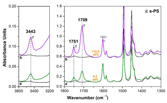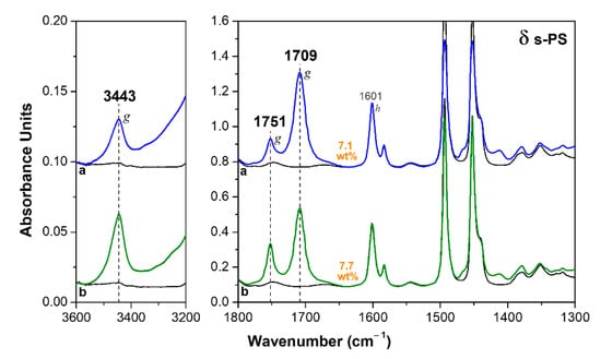 FTIR spectra of a 60 µm axially oriented δ form film, after sorption of HA in two different conditions, are shown in Figure 3. The most relevant feature of these spectra is that two additional guest peaks clearly appear: a carbonyl stretching at 1751 cm−1, as well as a O−H stretching peak at 3443 cm−1, which is in the typical region of carboxylic acids at low concentration [47]. Both peaks are broad and barely detectable for the HA molecules absorbed in the amorphous phase. Based on an analogy with other carboxylic acids [37,38,39,40,41,42], and in agreement with a report from Kaneko and co-workers [34], these new peaks can be attributed to isolated guest molecules, while the peak at 1709 cm−1 can be attributed to hydrogen-bonded guest molecules.
