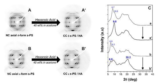 WAXD patterns of axially stretched s-PS films exhibiting the NC δ form before (A) and after HA sorption (A’) and the NC ε form before (B) and after HA sorption (B’). The equatorial profiles of these 2D patterns are shown in (C) (a, a’, b, b’).