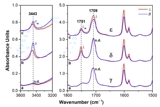 As for the HA guest peaks, dependent on the polymer crystalline form, some dichroism can be observed for the carbonyl stretching peaks at 1751 and 1709 cm−1, as well as for the hydroxyl peak at 3443 cm−1. In particular, the dichroism is absent for molecules absorbed by the γ form film (Figure 6a), thus confirming that HA molecules are not absorbed by the dense γ phase, but only absorbed in the poorly oriented amorphous phase.