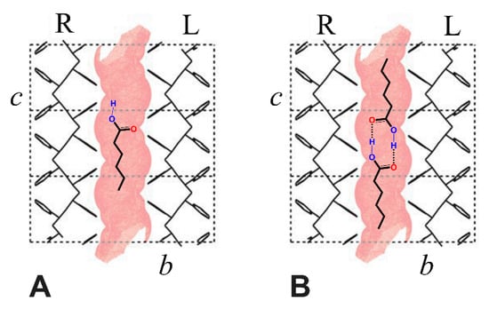 It is worth noting that the dichroism of the O−H stretching for HA isolated guest in both δ and ε phases is positive, indicating a preferential orientation of the O−H bond parallel to the crystalline polymer chain axis, independent of the kind of NC phase. Moreover, the dichroism of the C=O stretching for the isolated HA guest in the δ form, and for both isolated and dimeric HA guests in the ε form, are always negative, indicating a preferential orientation of the C=O bond perpendicular to the crystalline polymer chain axis. These orientations of the O–H and C=O groups, preferentially parallel and perpendicular to the polymer chain axis, respectively, can be easily rationalized for HA guest molecules in the crystalline channels of the ε form. In fact, these preferential orientations can be anticipated on the basis of two obvious structural features: (i) parallelism of the aliphatic chains (in their trans-planar conformation) with respect to the chain axes of the polymer crystalline phase; (ii) minimum energy conformation of aliphatic carboxylic acids, which exhibit the double bonded carboxyl-oxygen atom in an eclipsed position with respect to the β carbon atom [54]. This is shown for monomeric and dimeric HA species in the crystalline channels of the ε form by the schematic drawings of Figure 7A,B, respectively.
