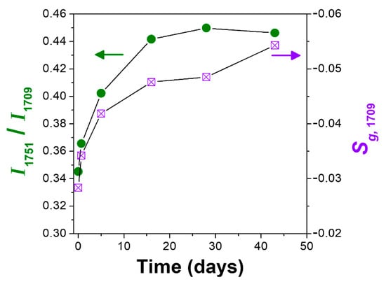 Additional relevant information comes by studies of HA desorption from s-PS CC films, e.g., at room temperature in air. In fact, the ratio between the two peaks corresponding to isolated and hydrogen-bonded HA molecules (I1751/I1709) increases with desorption time. This phenomenon, which occurs for both δ and ε form films, is shown for the ε form film (left scale in Figure 8) and can easily be rationalized by guest desorption from amorphous s-PS phases occurring faster than from CC phases [1,31,32].