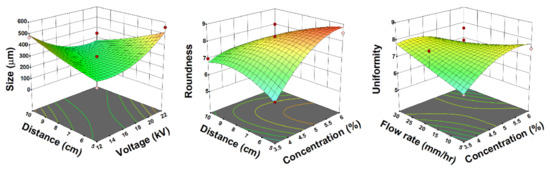 Three responses (size, roundness, and uniformity) were used for the optimization of the microsphere production process (Figure 1). The most important parameter impacting size was flow rate (p = 0.0039), with the general trend being that as flow rate increased, microsphere diameter increased, which is consistent with previous studies [17,18,19,20]. This is observed because with a larger the flow rate, more liquid is extruded through the syringe needle, yielding a larger droplet. The most significant interaction impacting size was that between voltage and distance (p = 0.0004). The relationship between voltage and size is supported by the concept of critical voltage. A sufficiently high voltage is required to overcome the surface tension of the droplet at the needle tip and to form small microspheres. The collection distance influences electric field strength. As the distance increases, the electric field decreases, resulting in larger microspheres [12,21,22,23]. Thus, the voltage has to be adjusted carefully with respect to distance.