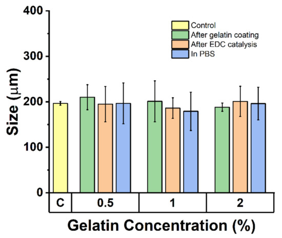 Images taken using the optical microscope were used for size analysis. At least 40 microspheres were analyzed per sample, employing NIH ImageJ software. As shown in Figure 3, the size of microspheres did not change significantly during gelatin coating or EDC catalysis, regardless of gelatin concentration. The SEM images (Figure 4) show how the microsphere surface morphology changes as the microspheres proceed from having cracks and surface irregularities to having a smoother surface upon gelatin coating and EDC catalysis.