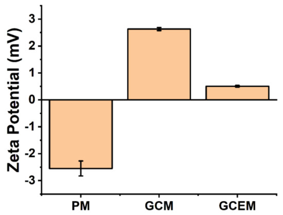 Microspheres with a positively charged surface show potential for cell adhesion and proliferation, as negatively charged cell membranes can attach to positively charged microspheres through electrostatic interactions [26,27]. Gelatin-coated microspheres showed positive surface charges, as expected (Figure 5). EDC catalysis caused a decrease in the positivity of surface charge due to the formation of amide bonds (i.e., losing amino groups, the main contributor to the positive surface charge).
